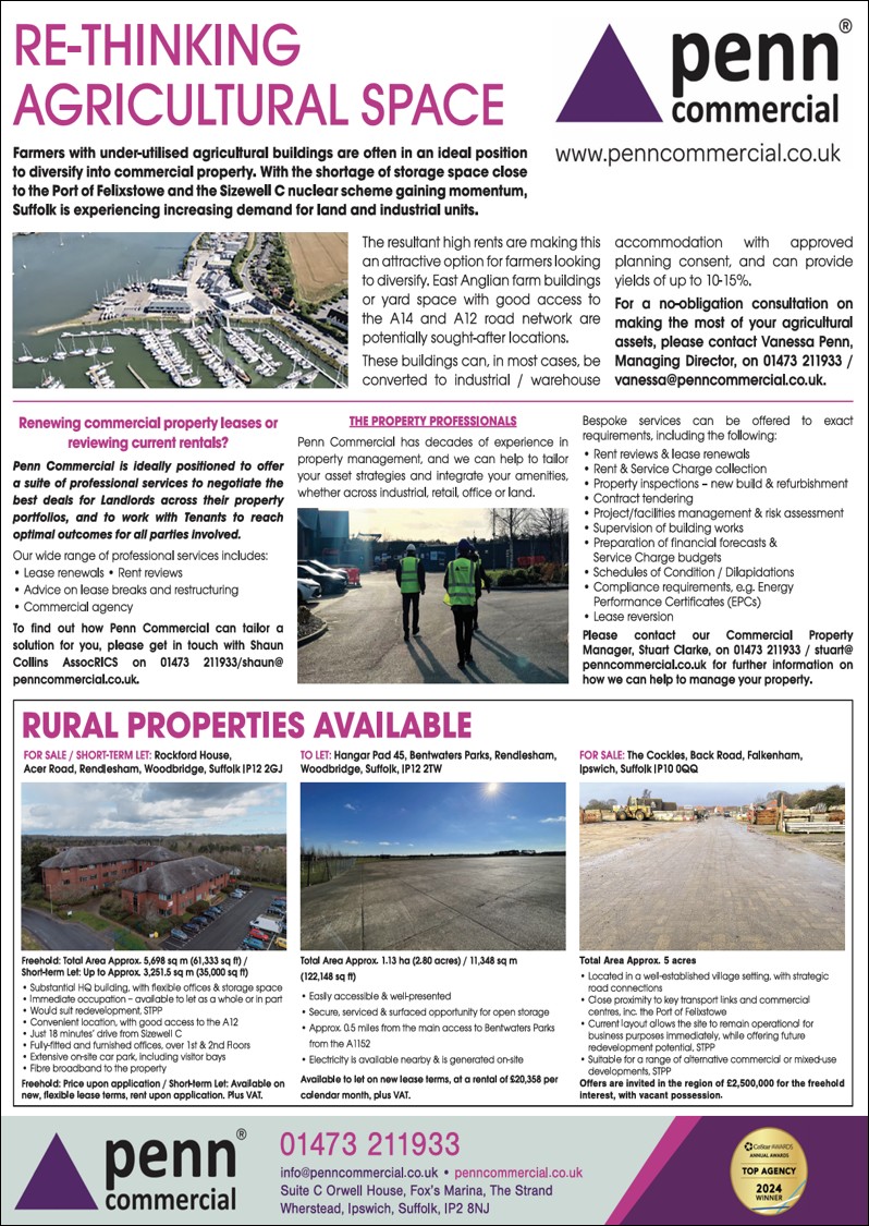 For more information call 01473 211933, email vanessa@ penncommercial.co.uk, or visit the office at Penn Commercial, Suite C, Orwell House, The Strand, Wherstead, Ipswich, Suffolk IP2 8NJ. www.penncommercial.co.uk